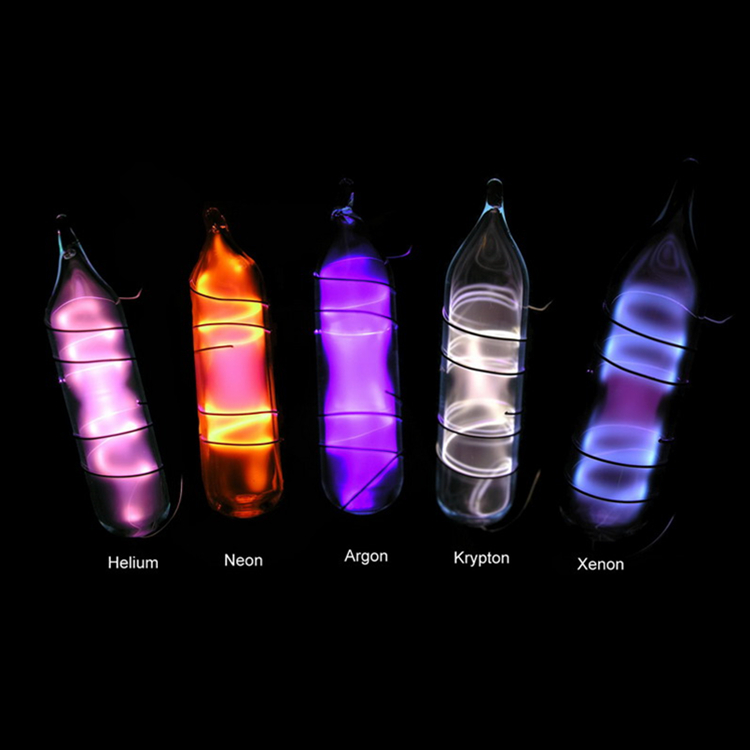 不同的氣體在不同的條件下會(huì)發(fā)出不一樣的光,一般氦氣—-橘紅 ,氖氣—-紅,氬氣—-藍(lán)紫氪氣—-黃綠,氙氣—-與陽光顏色相同。